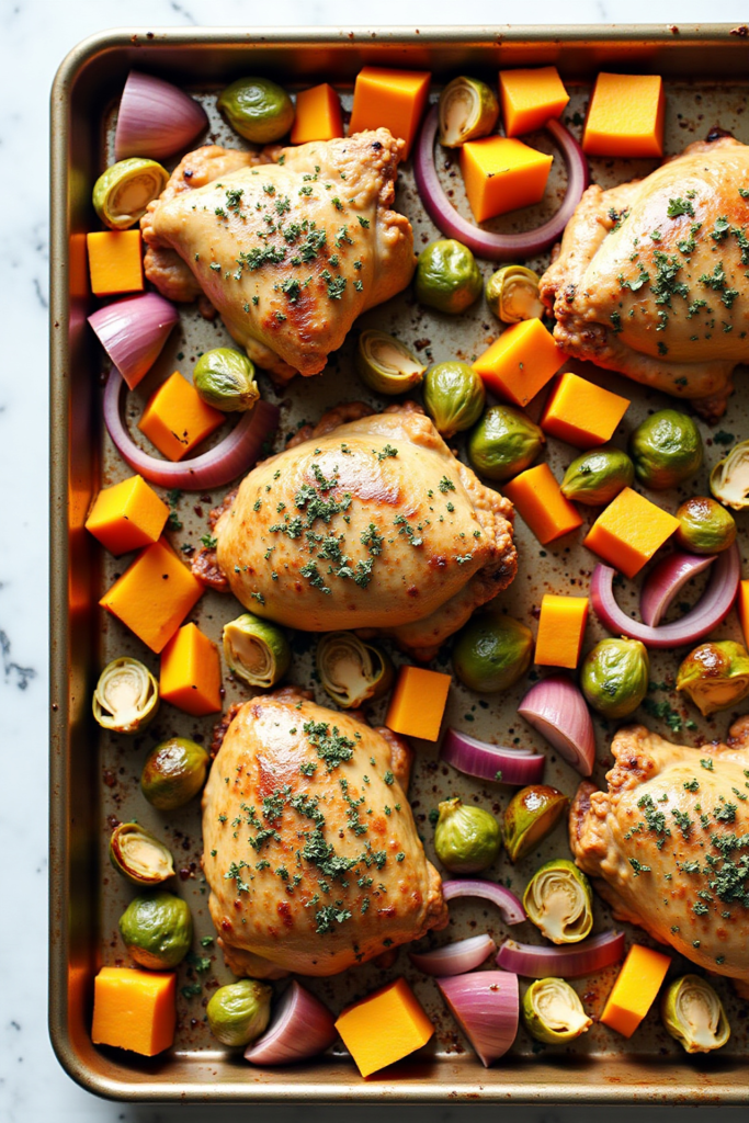 Start with a protein like chicken thighs, sausage, or tofu for a plant-based twist. Add in a mix of seasonal vegetables—chunky carrots, cubed sweet potatoes, Brussels sprouts, or red onions work beautifully. Toss everything with olive oil, a sprinkle of salt and pepper, and a generous helping of autumn-inspired herbs (rosemary, sage, and thyme are classics). Roast on a sturdy sheet pan until caramelized and golden, then scoop generous portions directly into bowls for serving.
